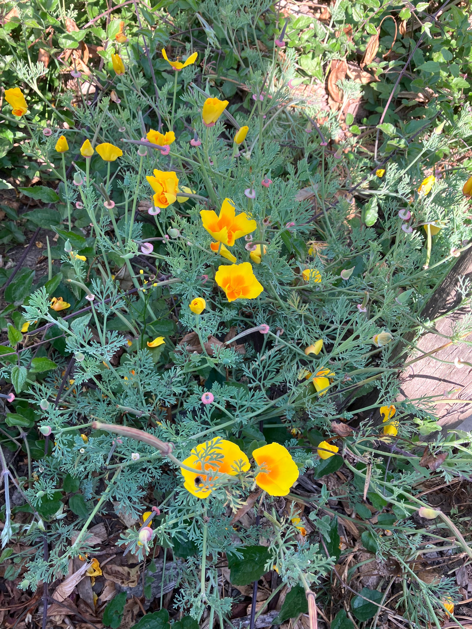 The coastal form of the California poppy is a mounding, low-growing plant with striking gray-green foliage and blossoms that are the essence of yellow, with a deep orange center that varies in size. It is perennial and blooms for at least 3 and up to 7 months, between February to June, or even longer near the coast. It reseeds reliably, and is great for bouquets.
